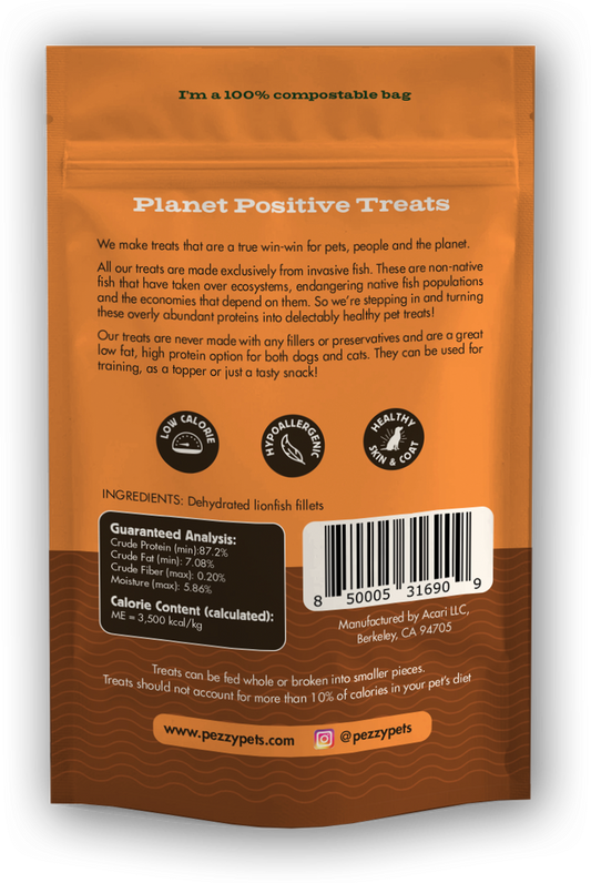 Single and limited ingredient treats made exclusively from invasive fish. Pezzy treats are great for pets, people, and the planet as a whole!
